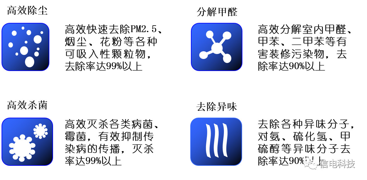信電樓宇中央空氣凈化系統采用以下六大核心凈化技術(shù),達到高效除塵、高效殺菌、高效除味和低運行費用等八大技術(shù)特點(diǎn),第三方權威檢測機構的測試報告表明其極好的凈化效果。