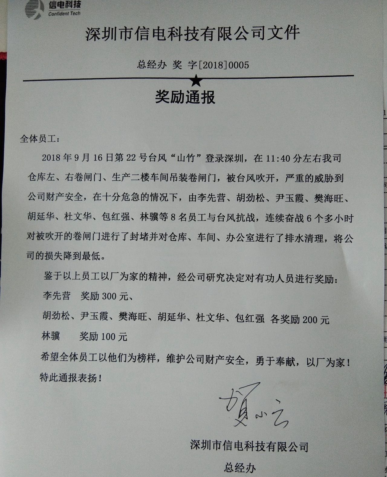 經(jīng)過(guò)大家的努力搶險,連續奮戰6個(gè)多小時(shí),極大減小了臺風(fēng)對公司造成的損失。非常感謝這些抗臺風(fēng)勇士們,為此公司總經(jīng)辦還給出通報表?yè)P和獎勵。