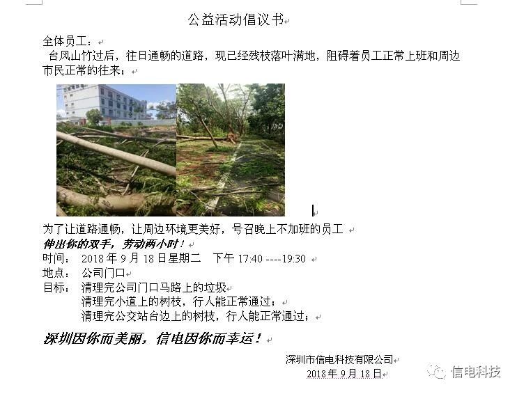 由于道路被刮倒的大樹(shù)所堵,廠(chǎng)區內一片狼籍,臺風(fēng)過(guò)后,公司又號召員工參加志愿者,對廠(chǎng)區和道路進(jìn)行清理和災后重建,并貼出“公益活動(dòng)倡這議書(shū)”。