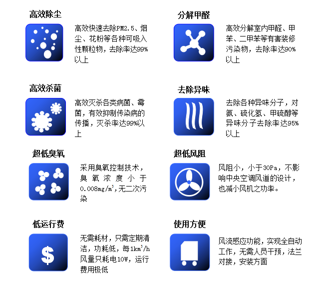去除0.01um以上的小顆粒物,5um以上顆粒物去除率100%,0.5um以上顆粒物去除率為95%,殺菌率為96% |