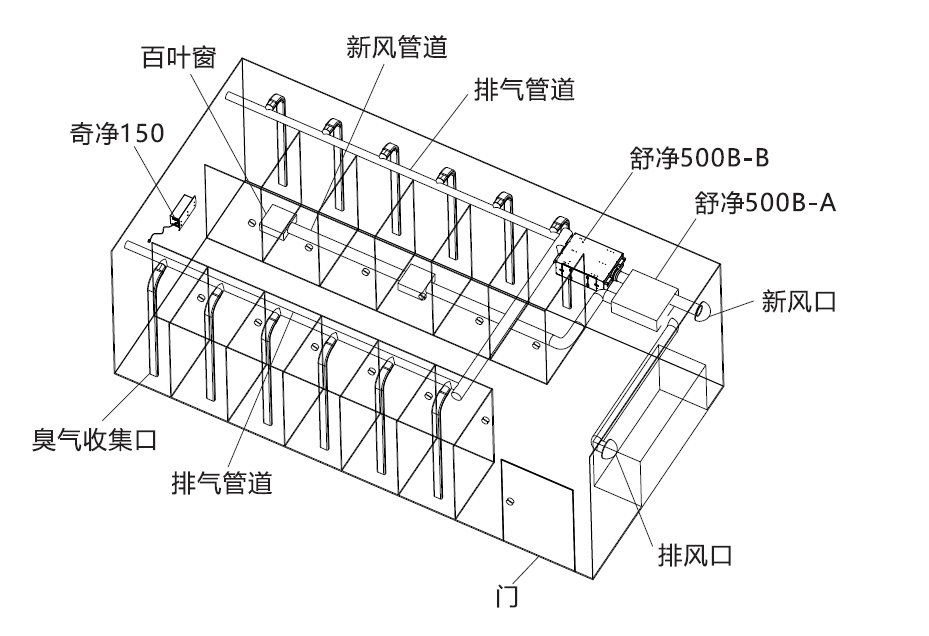 采用舒凈系列雙向流熱交換新風(fēng)除臭機+奇凈系列除臭殺菌機